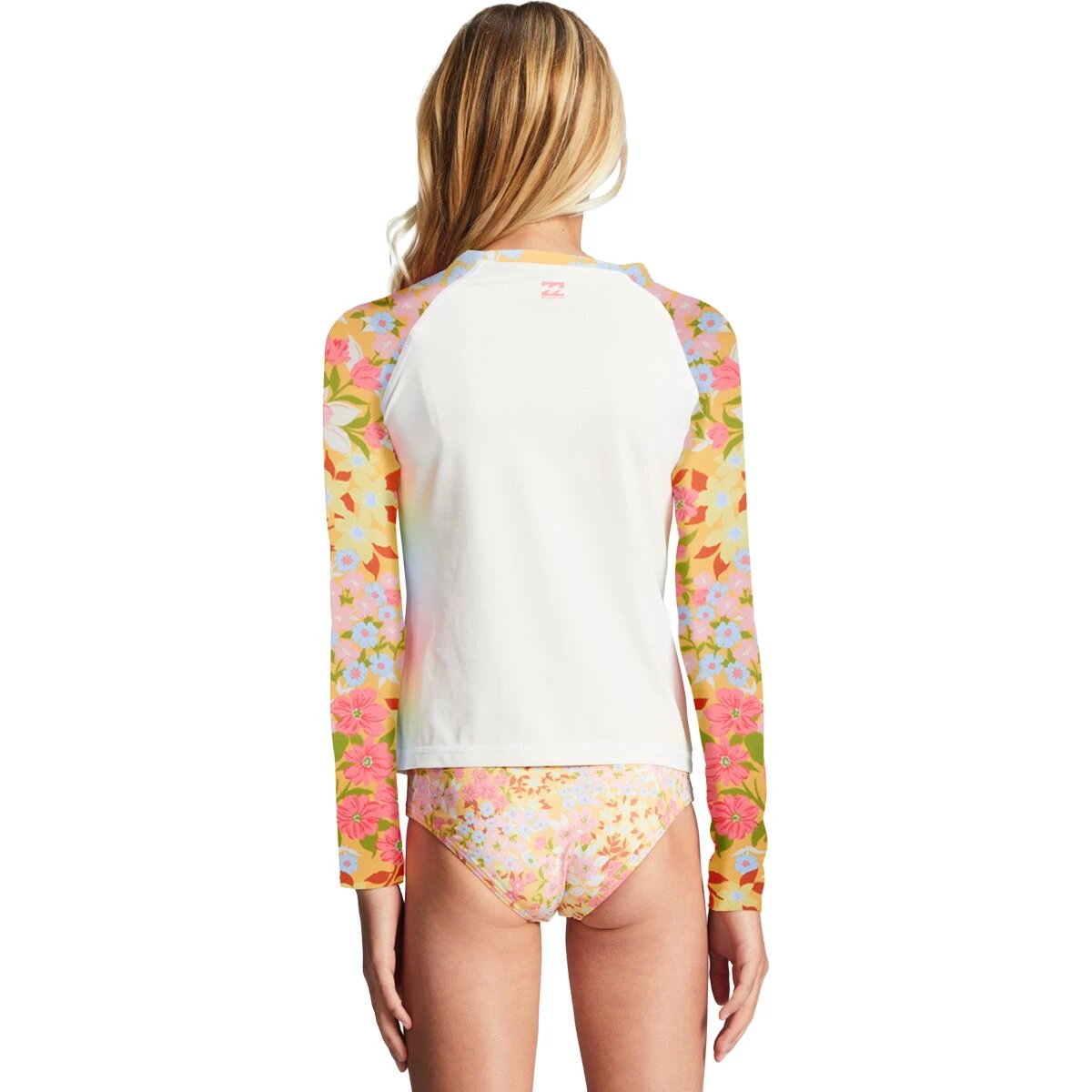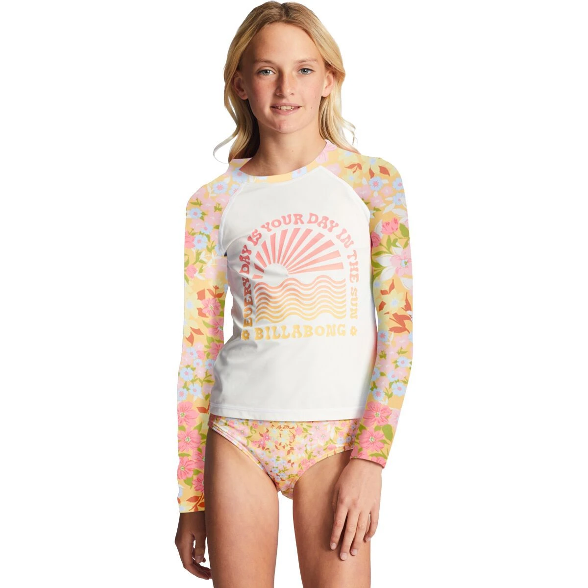 Made of recycled stretch fabric, this rashguard set for girls includes a long-sleeve top with printed sleeves and chest graphics, plus a matching swim bottom.