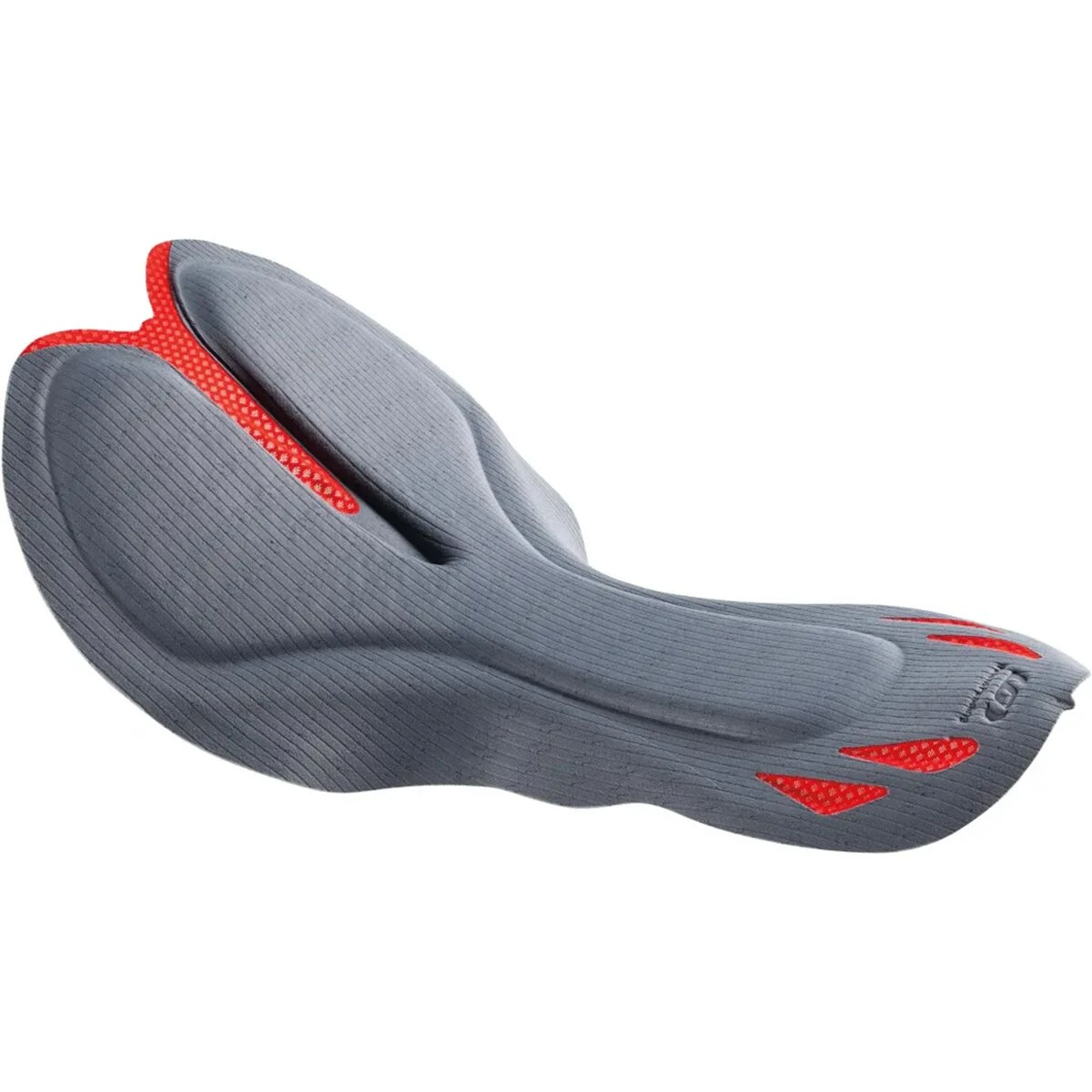 The shorts’ 11 ergonomic panels are held in their assigned locations by straps of Highlander Mesh bibs mated to a Carbon X-Mesh back for an overall bib construction that breathes and wicks (the Highlander Mesh) and absorbs fatiguing road noise without absorbing moisture (the Carbon X-Mesh). The 4 Motion chamois brings up the rear with frontal vents, bacteriostatic properties, and smoothly transitioning thicknesses of perforated foam padding relieved with a central channel.