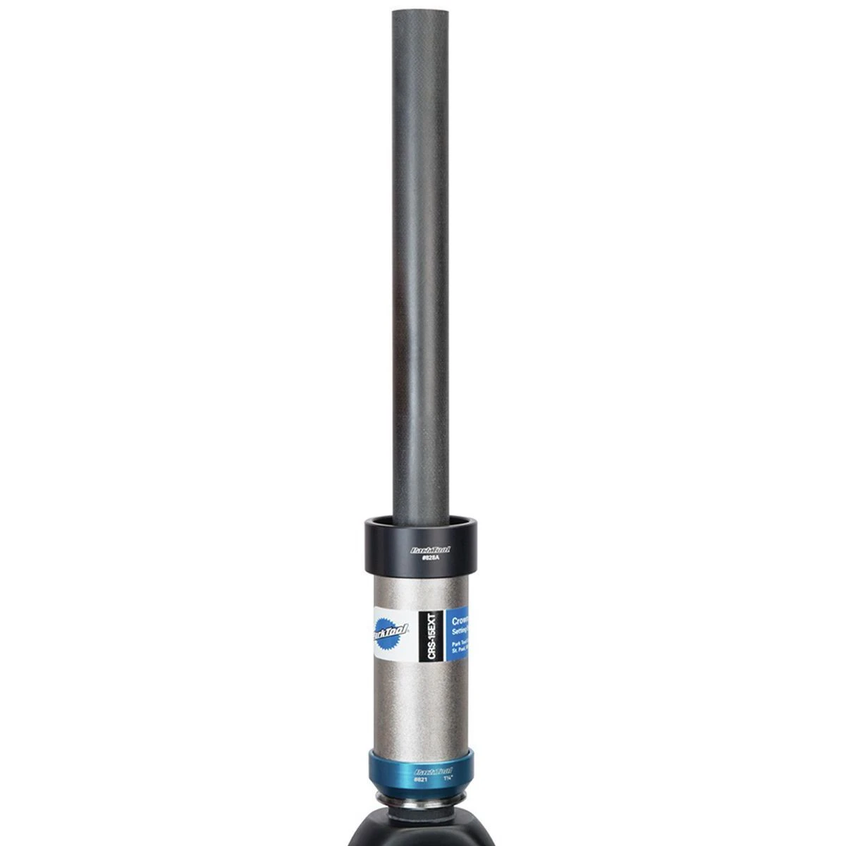 Pro tip: if your fork’s steerer tube is longer than your crown race setter, no matter how hard or how many times you hammer the tool, you’ll never seat the crown race since the tool makes contact with the top of the steerer before it ever has a chance to reach the crown. Get a little help with the Crown Race Setting System Extension – CRS-15EXT from Park Tools which includes an extension tube and fitting to add a little length to the CRS-15 and 15.2. The extended length will now let you set a crown race on forks with steerer tube up to 425mm.
