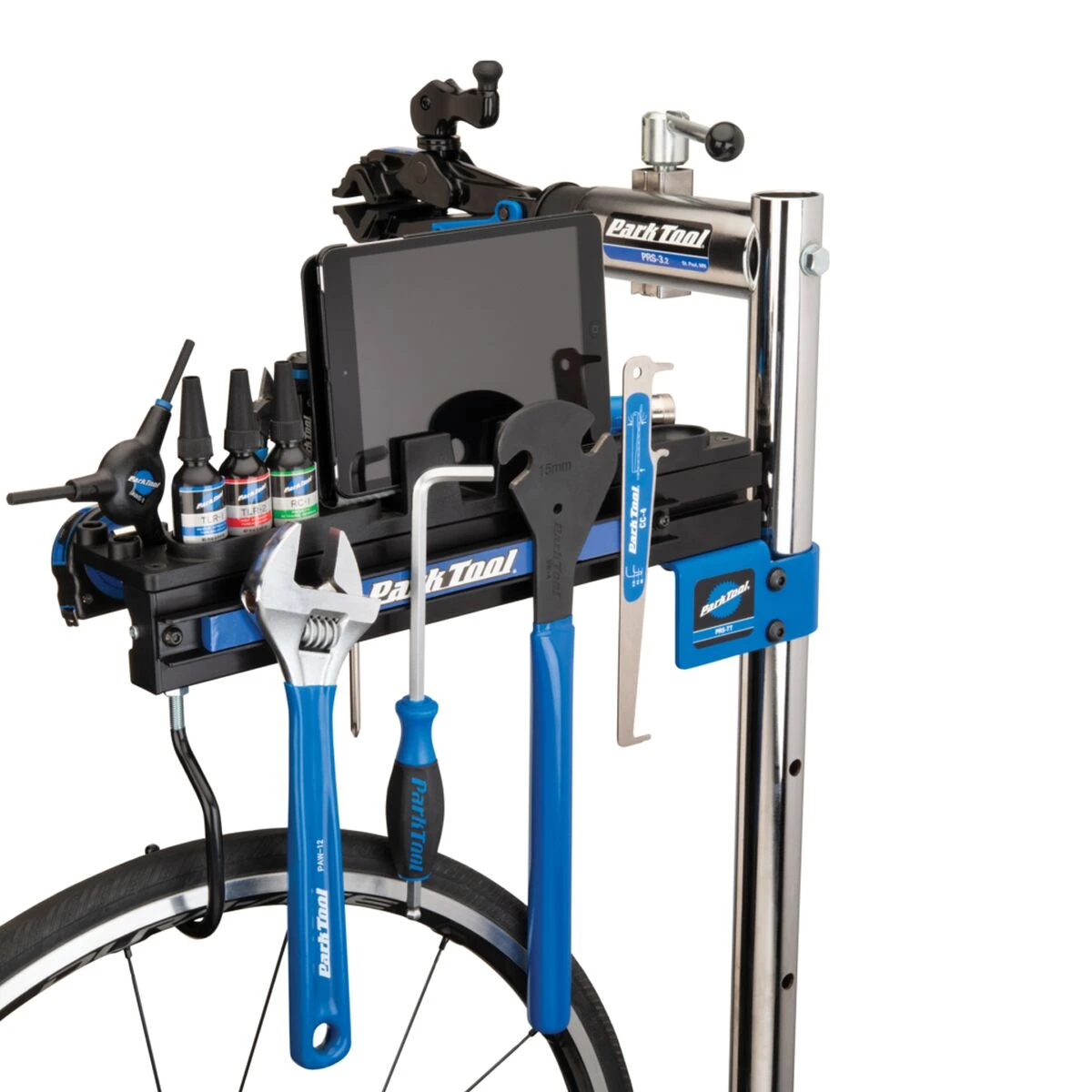 A versatile and convenient way to keep tools, supplies and technology at arm’s length on most professional single and double arm Park Tool repair stands.